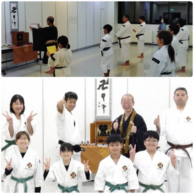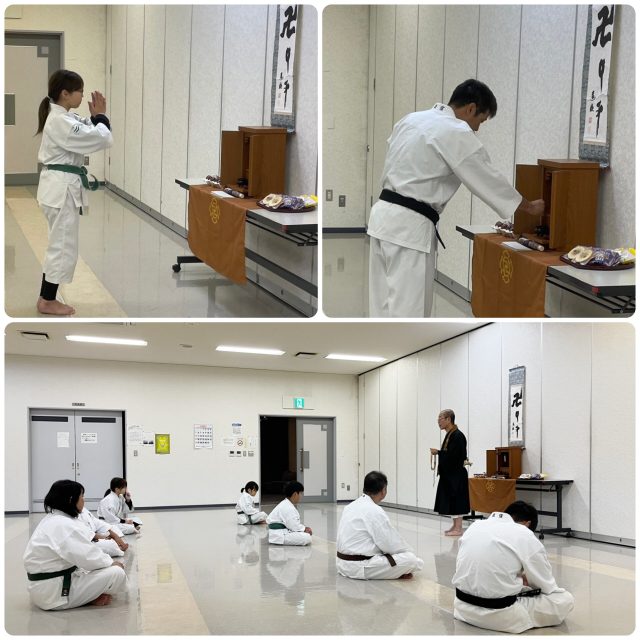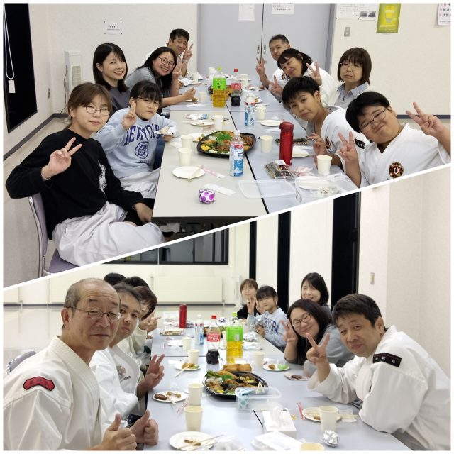 失敗や困難から何度でも立ち上がり、強く優しい人間を目指そうと話しました。奉納演武は、兄弟拳士に行ってもらいました。儀式終了後は、夕食会を催し、美味しく楽しく頂きました。