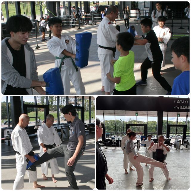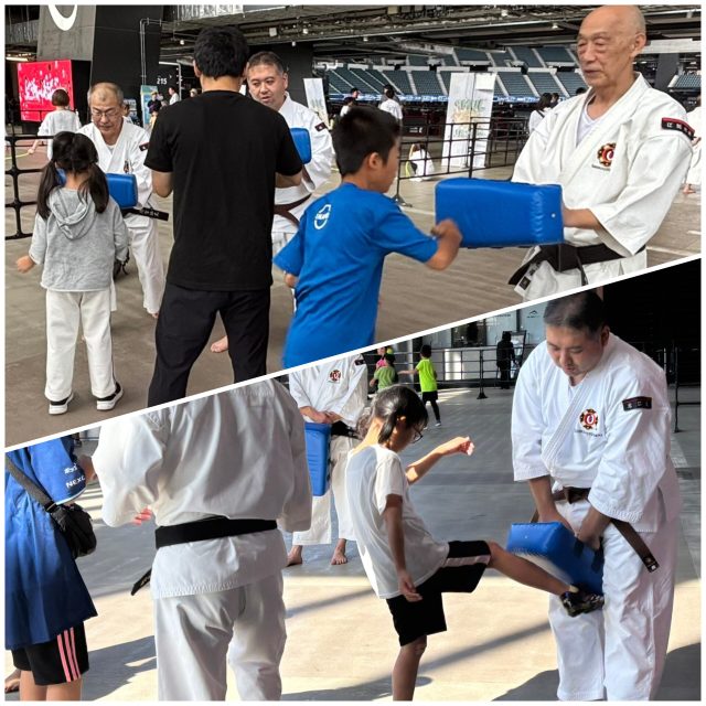 エスコンフィールド北海道で開催された「Fビレッジスポーツフェスティバル2025」において、ミットを使って目打ちや金的蹴りを体験してもらっている様子です。少林寺拳法は護身術であることから、いざという時には、鍛えられない目や金的を狙います。