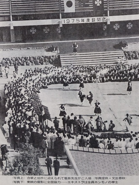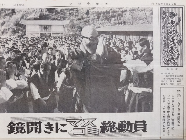 この年の1月12日に本山で挙行された鏡開き式について、特集が組まれていました。式に先立ち、2月15日封切りの東映映画「少林寺拳法」の一コマに使われる1,500名の拳士による団体演武の撮影が行われたこと、マスコミ関係者が多く詰めかけたこと、主役として創始者の役を演ずる千葉真一に創始者自ら技術指導を行ったこと等が記載されています。