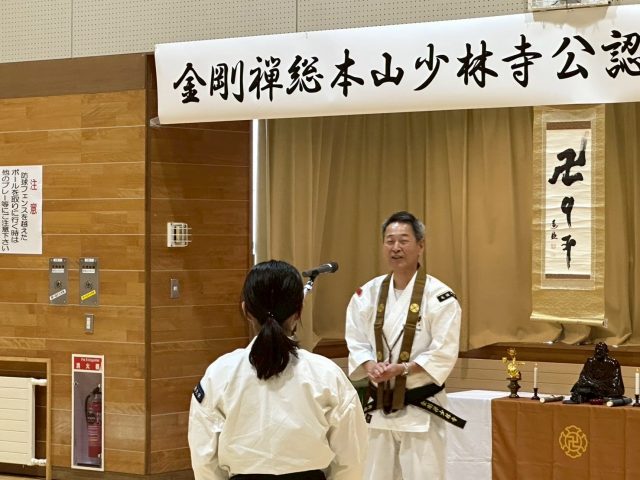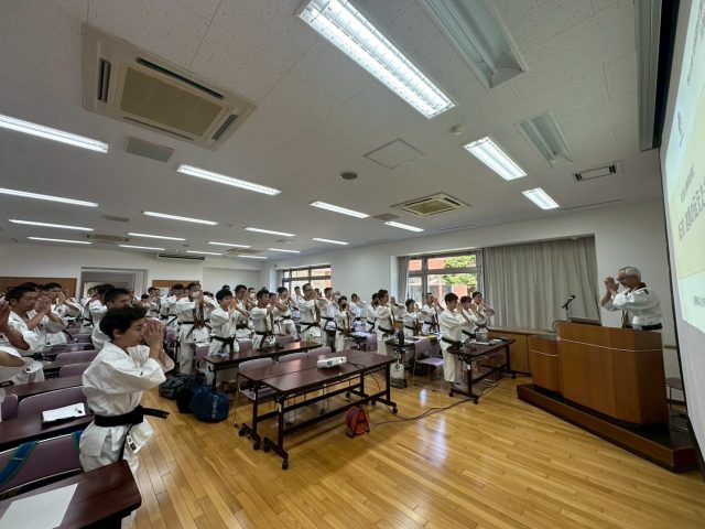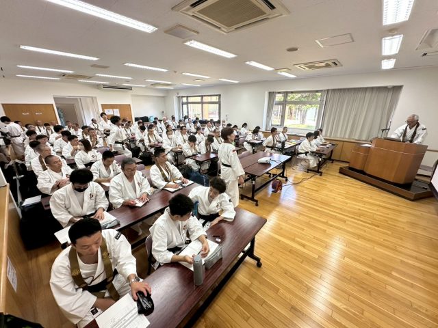 教区ブログ【本山公認】教区講習会 その1 2025年10月5日達磨祭終了後、本山公認講習会が開催されました。 【法階講義】大澤管長の法階講義では『達磨の伝えたもの』というテーマで、祖師達磨の伝えた正しい釈尊の教えと易筋行による修行法について講義いただきました。参加者の中には中学生や緑帯、茶帯の拳士も多数おりましたが、その拳士たちにも大変わかりやい講義をしていただき、真剣な眼差しで講義に臨んでおりました。法階講義においても会場に入りきらずはみ出ての受講者もいて達磨の伝えたものについて熱心に耳を傾けていたました。