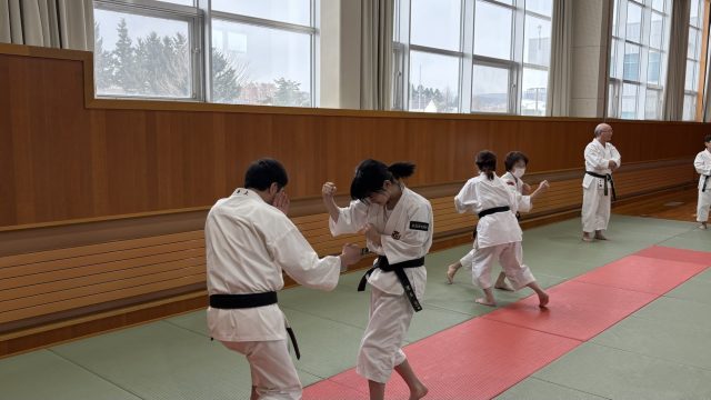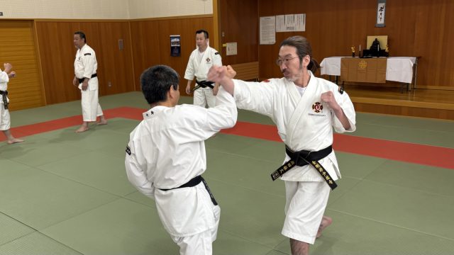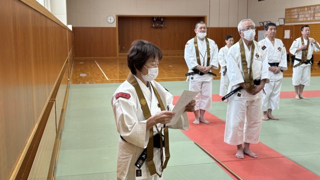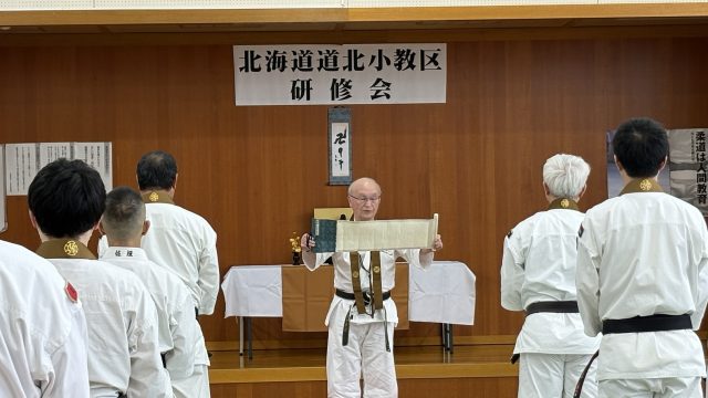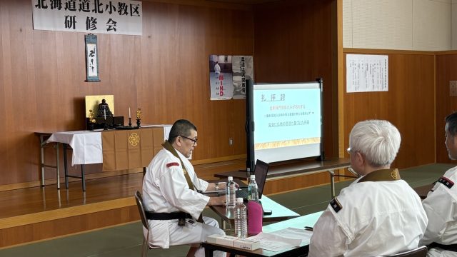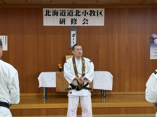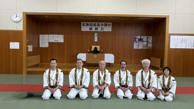右から旭川神楽道院 坂口道院長・旭川西道院 小泉道院長 ・旭川東道院 原田道院長・名寄ピヤシリ道院 酒田道院長・富良野光明寺道院 青木道院長・旭川南道院 田村道院長